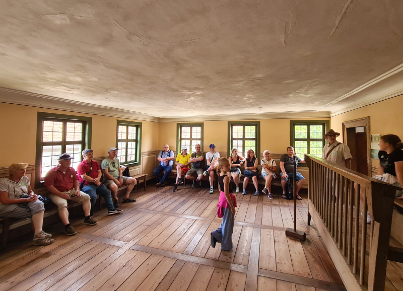 Bei der anschließenden Führung durch das Gelände tauchte die Reisegruppe in frühere Zeiten ein, Baracken aus der Flüchtlingszeit über ein Fertighaus aus den frühen 50er-Jahren bis hin zur historischen Kornmühle und dem Tagelöhnerhaus war alles dabei und alles sehr eindrücklich. Von da aus ging es weiter nach Dinkelsbühl, wo die Zimmer bezogen und ein gemeinsames Abendessen eingenommen wurden. Dann stand noch eine abendliche Stadtführung auf dem Programm. Beim Rundgang durch die schönen Gassen wurden wir vom Dinkelsbühler Dreigestirn überrascht, welches uns mit Musik, Gesang und Wein verwöhnte. Nach so vielen schönen Eindrücken fand der Abend in einem schönen Biergarten seinen Abschluss.